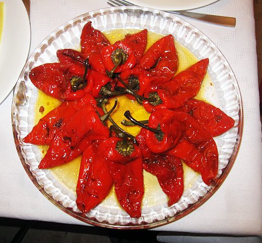- Slowly heat the olive oil, and add the peppers, whole, sprinkling coarse salt on them.