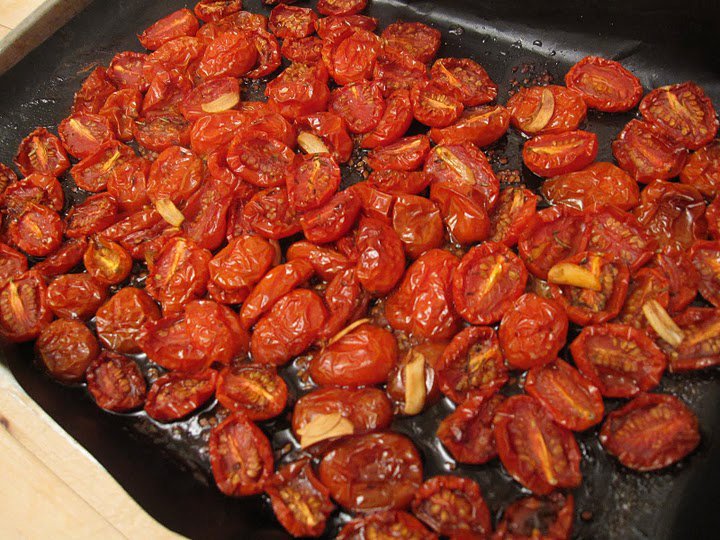 These oven dried cherry tomatoes can be used as a condiment, or as a sauce for pasta, or served on rice. They are easy to make, and when baked in a slow oven, the natural sweetness of the tomatoes becomes more intense and the result is delicious.