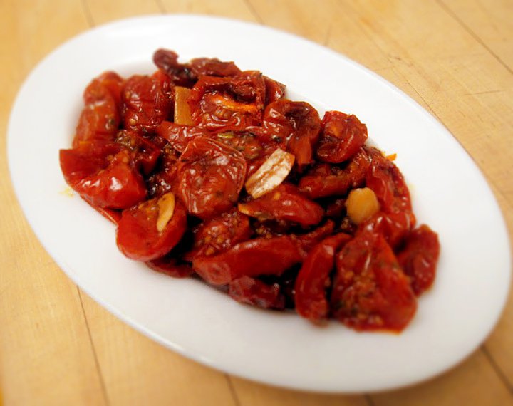 - When ready, take out of the oven, and place in a glass or plastic box. The oven-dried cherry tomatoes may be served on pasta (together with all the juices that are in the pan), or on rice, or as a condiment at a meal. It may be refrigerated for a few days in a closed box.