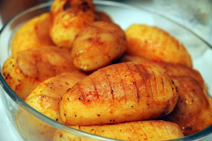 - TIP: you may also make these potatoes in a “cookie” baking bag – cut the potatoes the same way, and put them in the bag, adding the spices and butter. Close the bag and “massage” the potatoes a bit, till all the spices evenly coat the potatoes. Make 3 small slits in the top of the roasting bag, so that steam can escape.