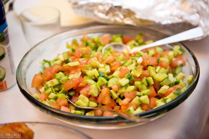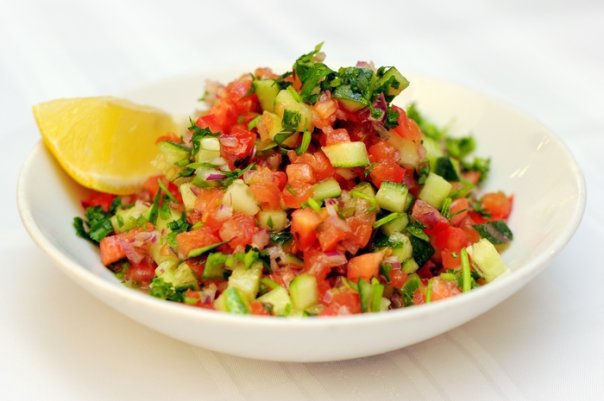 This is a basic Middle Eastern vegetable salad; cucumbers and tomatoes are the basis for this salad, but you can add chopped onions, scallions or shallots, chopped parsley, chopped mint (na’na), chopped carrots, chopped red or yellow peppers, and what I like best of all, chopped celery leaves (the inner leaves that are fresh, light in colour, crispy).