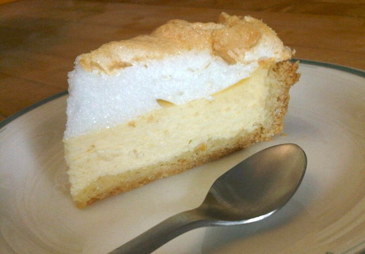 This is a typical Central European cheesecake. It has a “short” cookie-dough crust on the bottom, and a meringue of beaten eggwhites on top. The cheese filling has a touch of lemony aroma from grated lemon zest. The cake is firmer than the typical creamy American style “NY Cheesecake”, and different also from the many varieties of Israeli style cheesecake.
