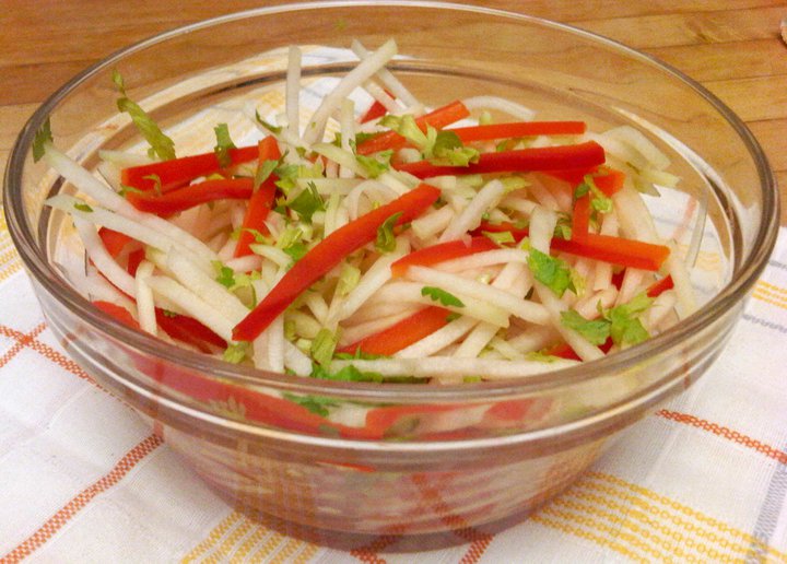 The vegetables are cut into matchsticks (“jullienne” strips). It is crunchy and very tasty, and I make it in different variations, depending on what is available at the market, or in our refrigerator. And with the mandoline slicer, it is so easy and quick to cut the kohlrabi into matchsticks. The red pepper I cut by hand (see below).