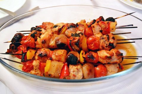 This dish can also be made at home, in a home grill (in the oven, using the grill option). Midway through grilling, turn the skewers over, so that the bottom side of the meat and veggies get grilled.