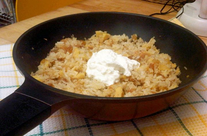 - Add the cooked rice, and mix with the apples, raisins and sugar in the pan.